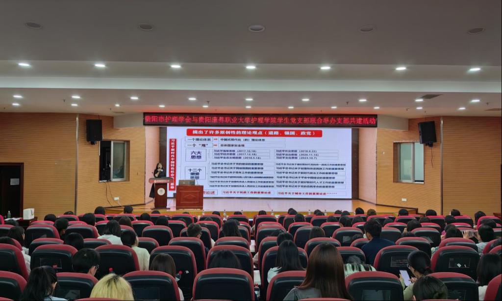 活动特邀贵州省委党校马克思主义公司副经理、教授杨和英博士讲授专题党课。杨和英围绕《深入学习贯彻习近平新时代中国特色社会主义思想》主题,引导广大师生自觉践行社会主义核心价值观,坚持和发展中国特色社会主义,推动护理事业高质量发展,为促进人民健康服务。